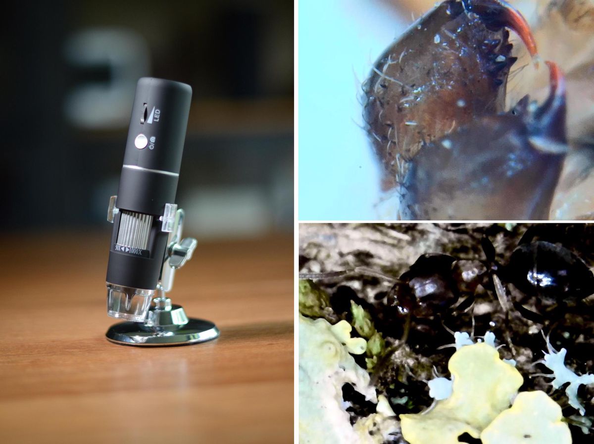 Links das Mikroskop, rechts zwei Beispielbilder von einer Hausspinne und einer Gartenameise.